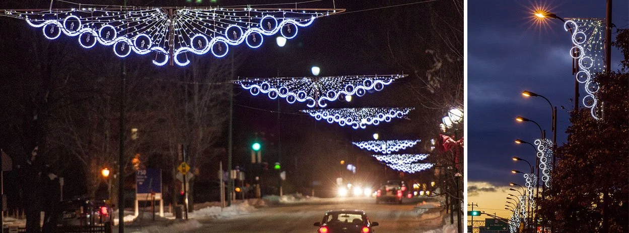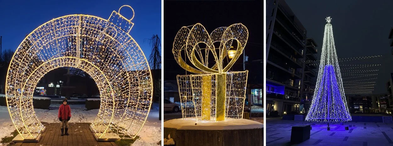 Ici, le décor Perle Scintillante est présenté à gauche en traversée, dans une des rues de Roberval. Modulable, il peut aussi servir de candélabre, comme le montre l’image de droite prise à Moncton.